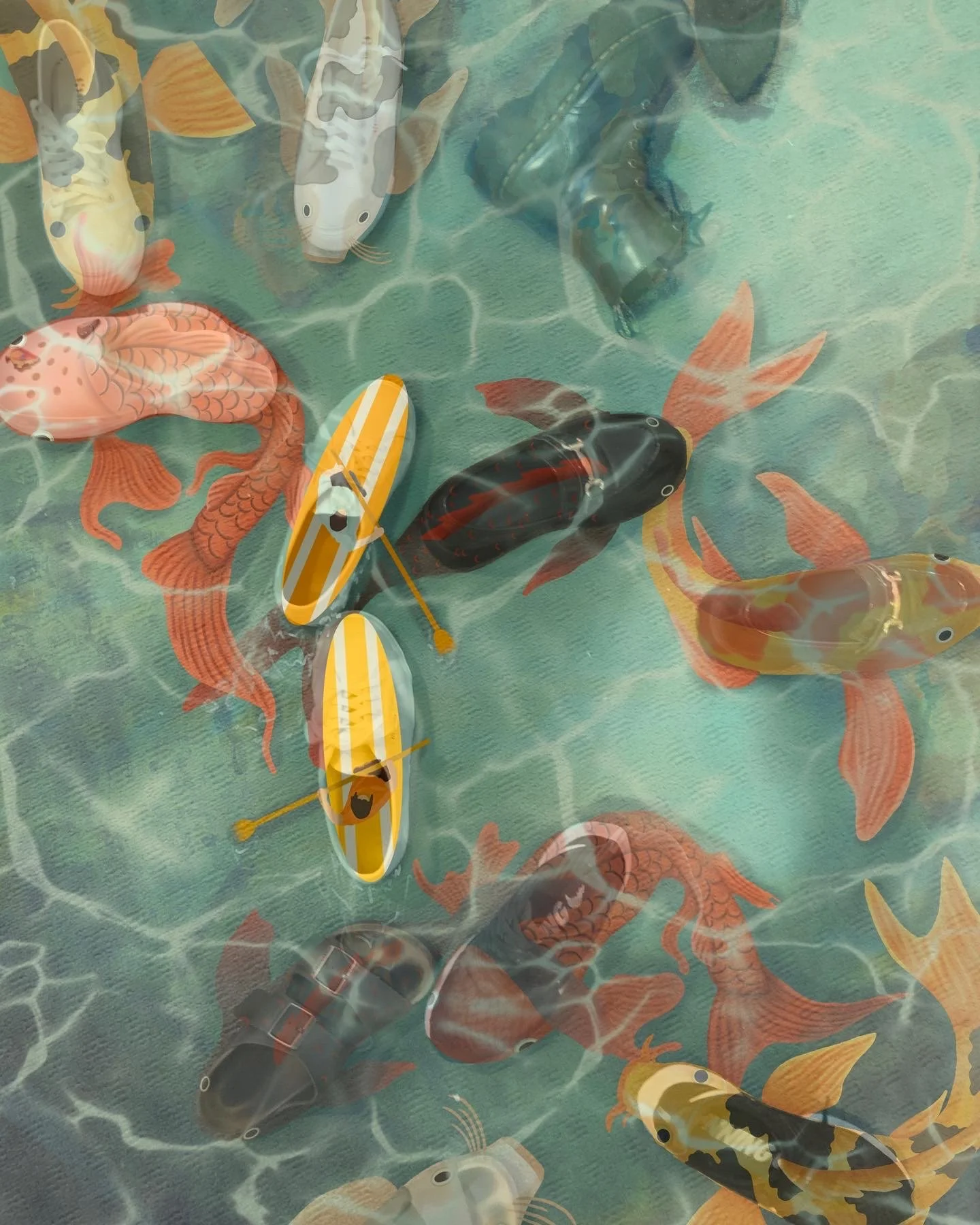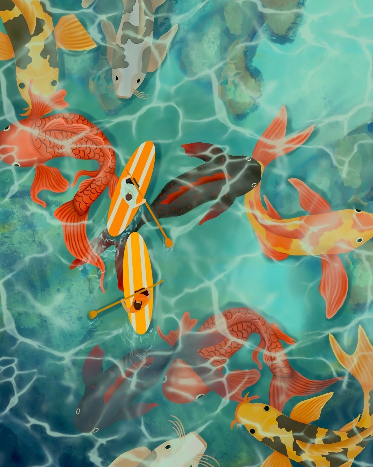A complementary colour palette brings harmony to the piece, balancing contrast with cohesion and tying the surreal elements together in a visually unified way.
