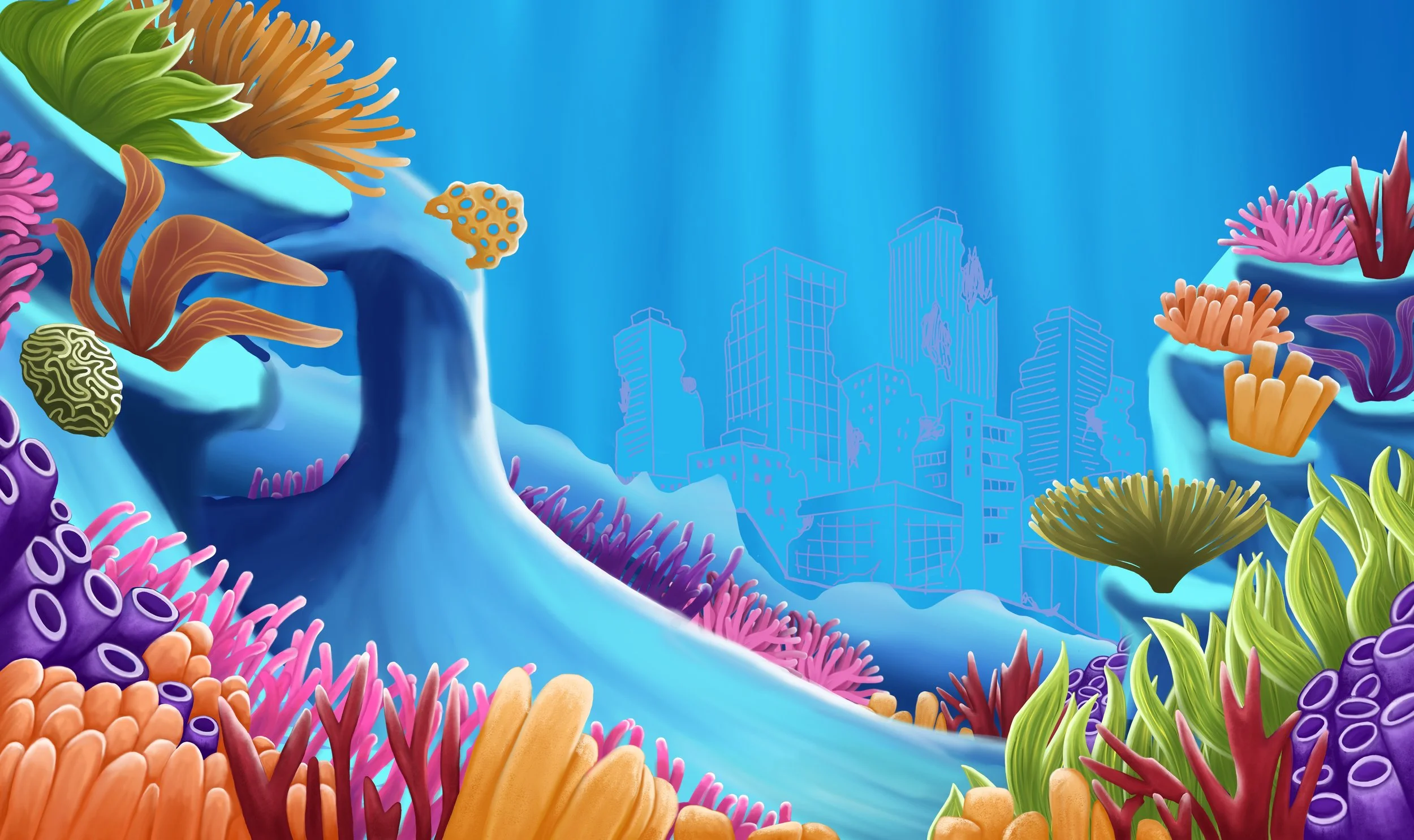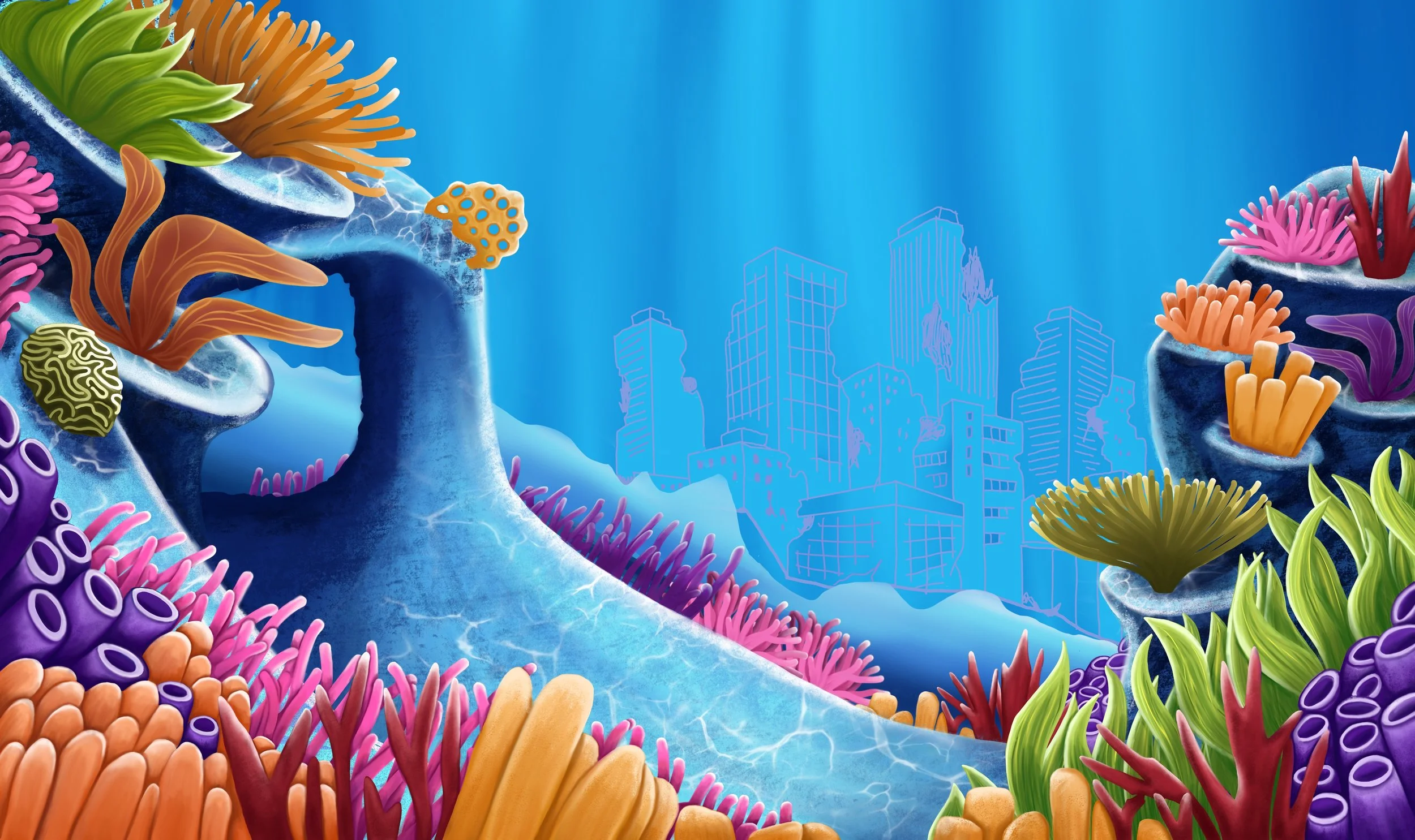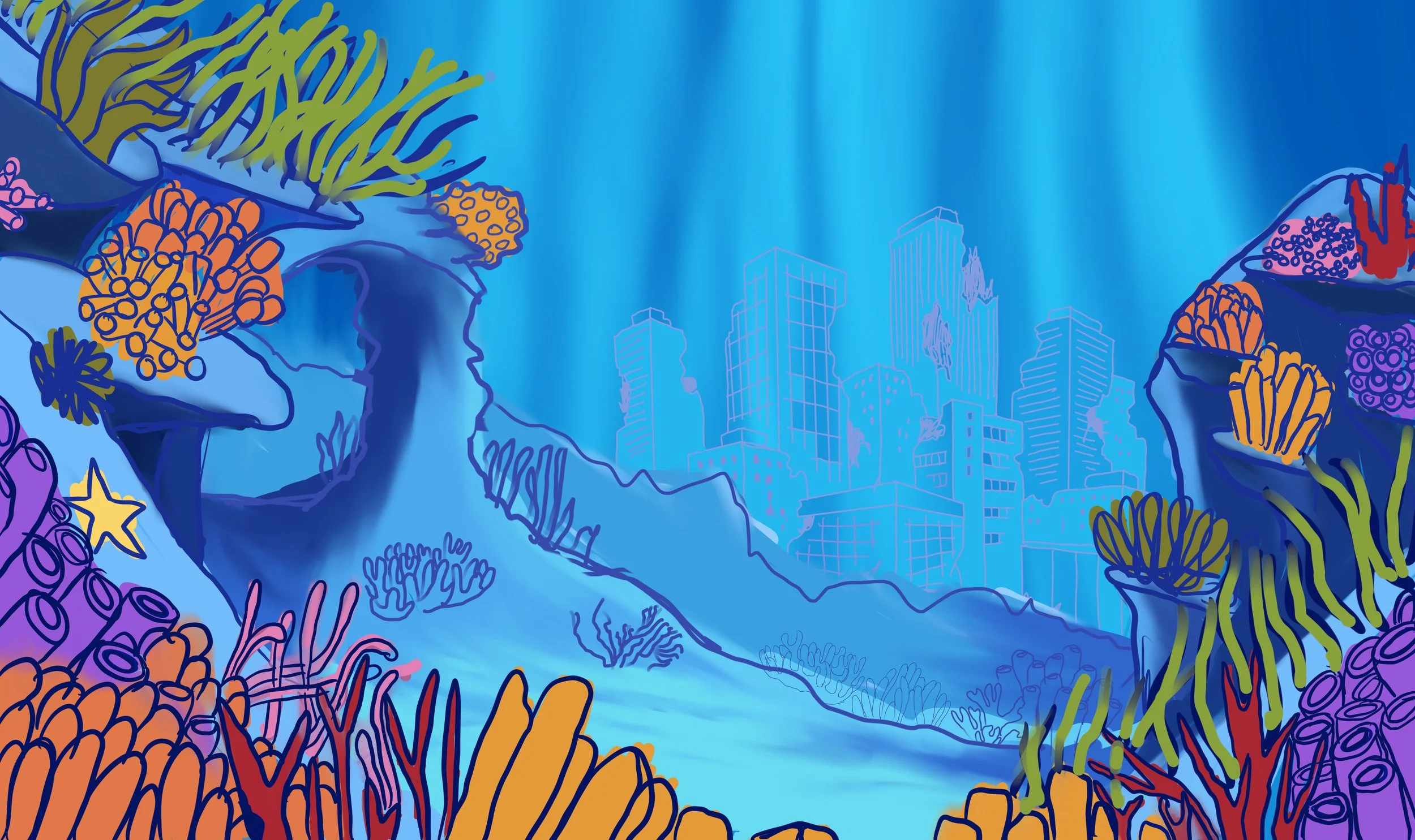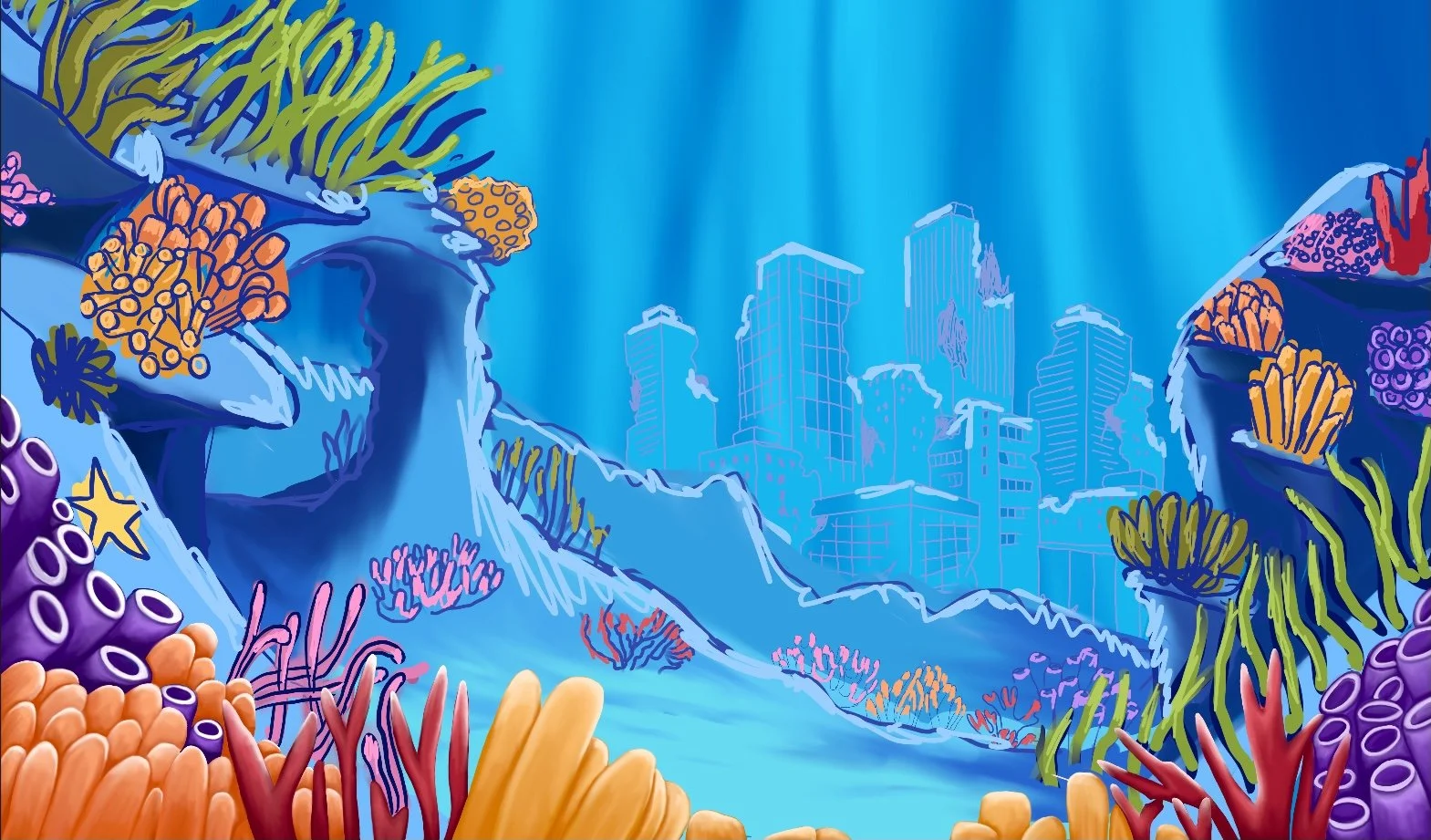 This illustration shows my skills as a visual storyteller. This illustration is called “Into The Blue” and is a scene from the opening credits of a family friendly animated film, set 2000 years into the future under the sea. A vibrant and colourful palette is used to create an inviting and friendly atmosphere to set the tone of the film.