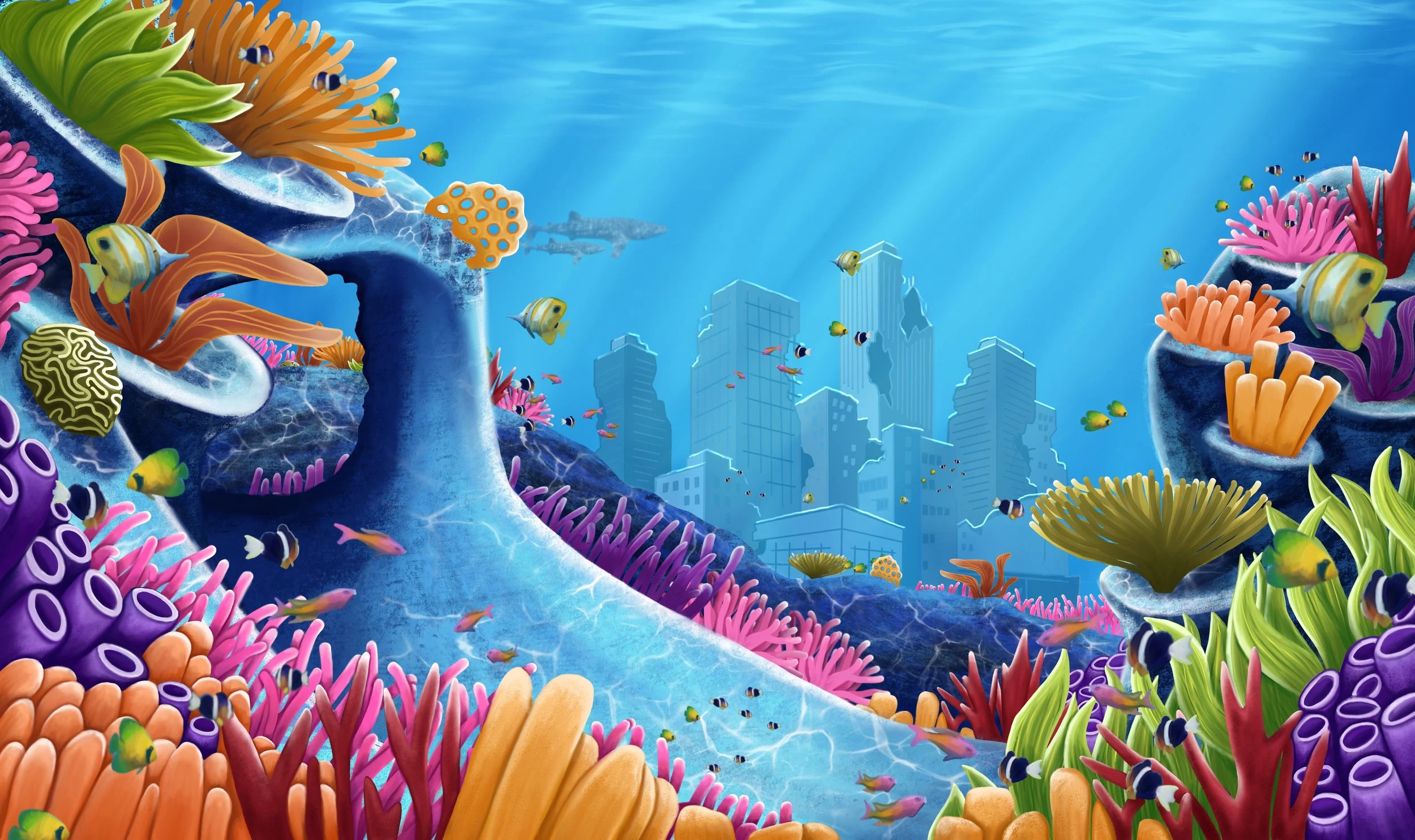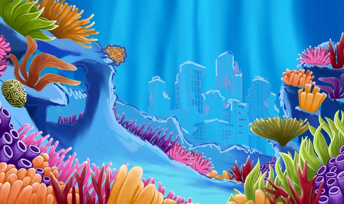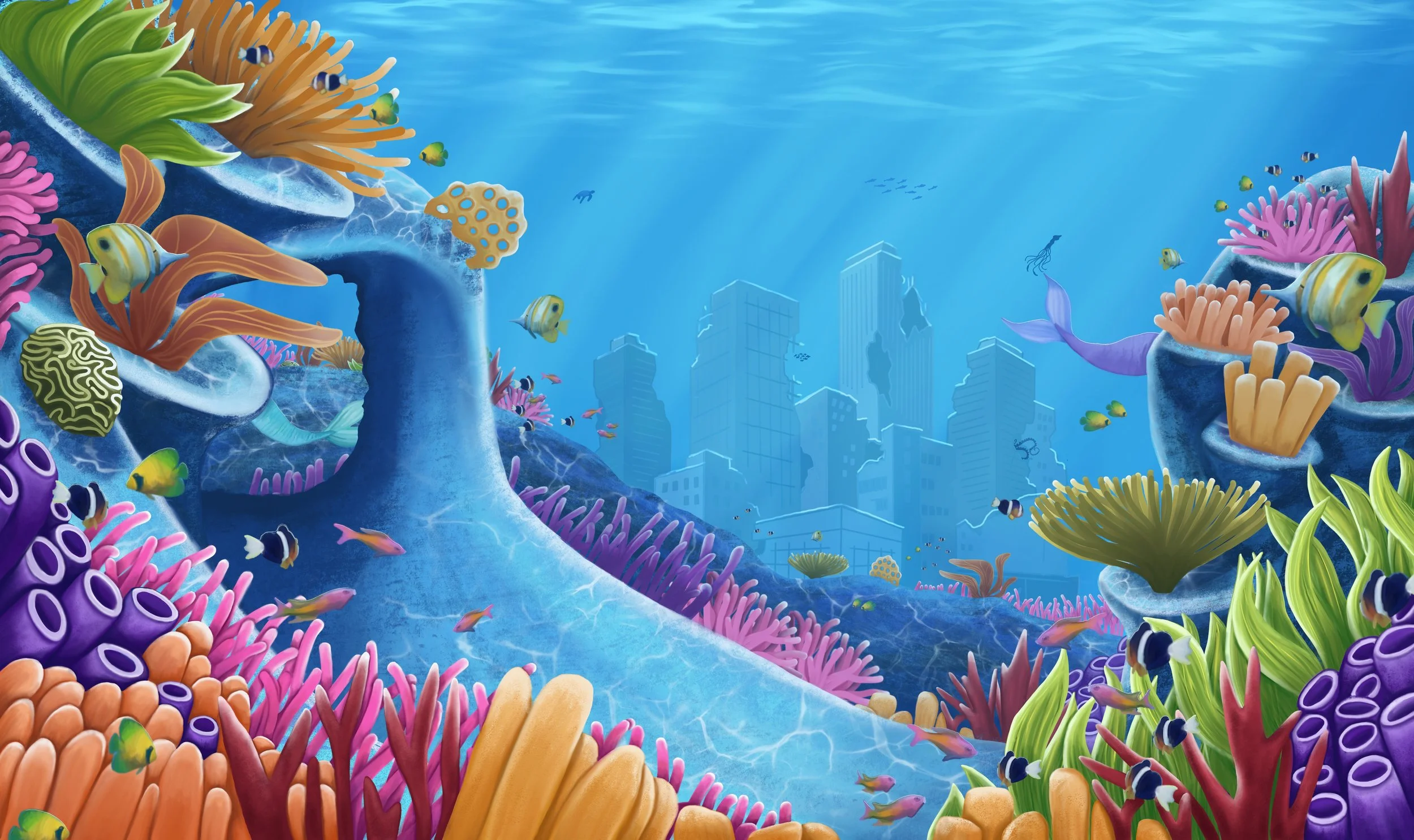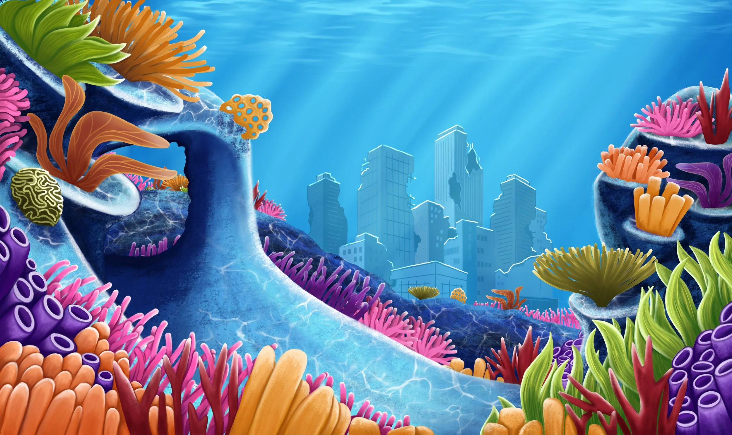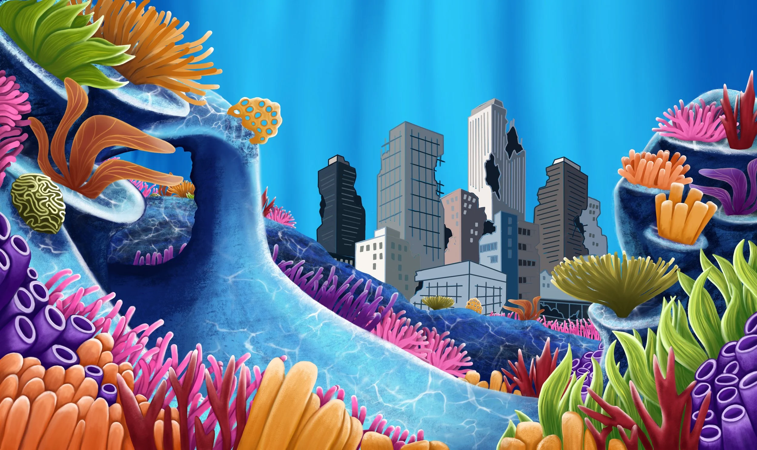 This illustration shows my skills as a visual storyteller. This illustration is called “Into The Blue” and is a scene from the opening credits of a family friendly animated film, set 2000 years into the future under the sea. A vibrant and colourful palette is used to create an inviting and friendly atmosphere to set the tone of the film.